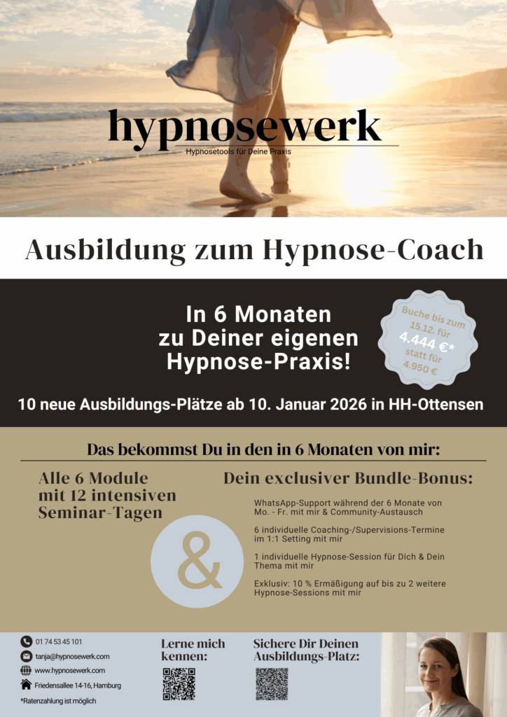 13.06.2026 von 10:00 – 18:00 h 14.06.2026 von 10:00 – 17:15 h | hypnosewerk Friedensallee 14 – 16 22765 Hamburg (Ottensen) |